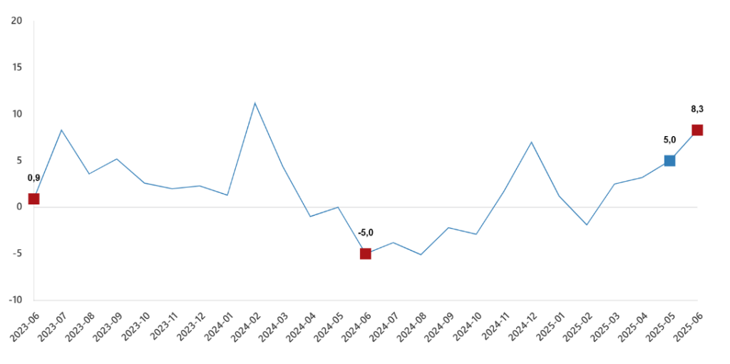 Türkiye İstatistik Kurumu (TÜİK) Haziran ayı itibarıyla Sanayi Üretim Endeksi verilerini açıkladı. Buna göre, sanayi üretimi yıllık bazda %8.3 artış kaydetti.