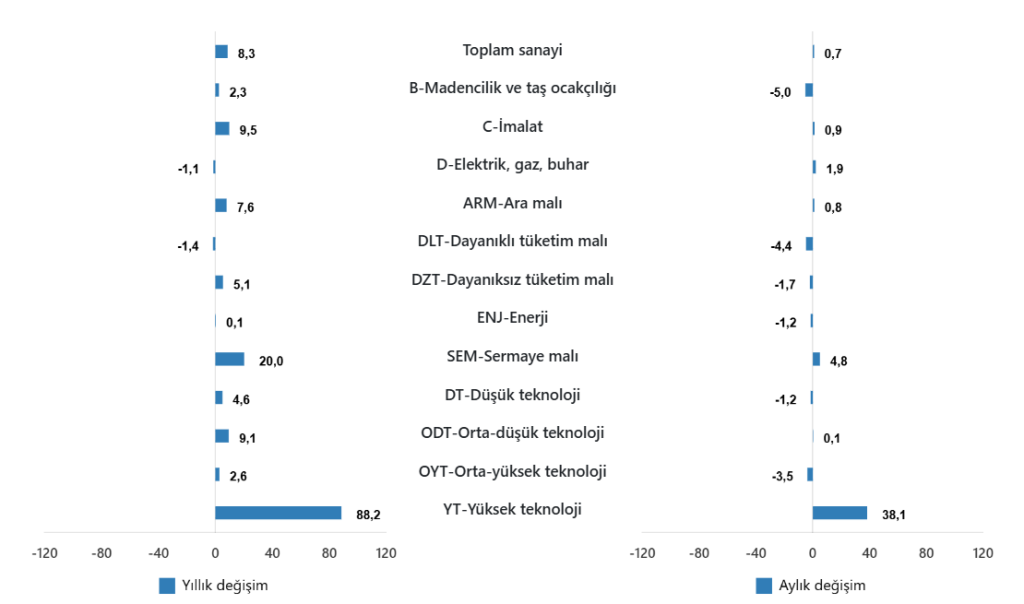 Sanayinin alt sektörleri incelendiğinde, 2025 yılı Haziran ayında madencilik ve taş ocakçılığı sektörü endeksi bir önceki aya göre %5,0 azaldı, imalat sanayi sektörü endeksi %0,9 arttı ve elektrik, gaz, buhar ve iklimlendirme üretimi ve dağıtımı sektörü endeksi %1,9 arttı.