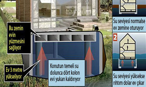 İngiltere'de sel sularında yükselerek su üzerinde yüzebilen ve böylece insan hayatını kurtaran akıllı bir ev tasarlandı. Projesi bu yıl tamamlanarak satışa hazır hale gelecek olan üç yatak odalı evin betonarme iskeletinin altında dört adet kolon bulunuyor.
