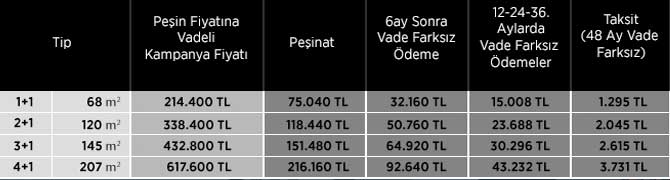 Konut teslimlerinin aralık 2019’da yapılması planlanan projede 6 mayıs 2018 tarihi itibarıyla satış fiyatları ve ödeme planı şöyle: