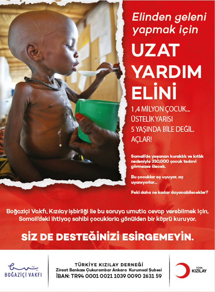 Boğaziçi Vakfı ve Türk Kızılay’ın iş birliği ile yürütülen yardım kampanyasına katılmak için TR94 0001 0021 1039 0090 2631 59 IBAN no’lu hesaba bağış yapılabiliyor. Açlıkla savaşan Somalili çocukların kalplerine dokunabilmek için siz de bağış kampanyasına katılabilir; vereceğiniz destek ile onlara nefes olabilirsiniz.
