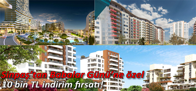 Türkiye’nin en büyük firmalarından Sinpaş Holding iştiraki Sinpaş Yapı, 15 Haziran Pazar günü kutlanacak olan Babalar Günü’nü 10 bin TL indirimle karşılıyor. Sinpaş Yapı, Sinpaş Liva Turkuaz, Sinpaş Liva Köyceğiz ve Sinpaş Altınoran projelerinden 14-15 Haziran tarihlerinde 1+1’den 4+1’e kadar ev alanlara 10 bin TL indirim fırsatı sunuyor.