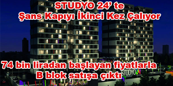 Yoğun ilgi gören projedeki stüdyoların çoğu kısa sürede satıldı. Ancak Stüdyo 24’te fırsatlar bitmedi. Stüdyo 24'ün B bloğu, 74.000 TL'den başlayan fiyatlar ve 7.400 TL'den başlayan peşinatlarla şimdi satışta!