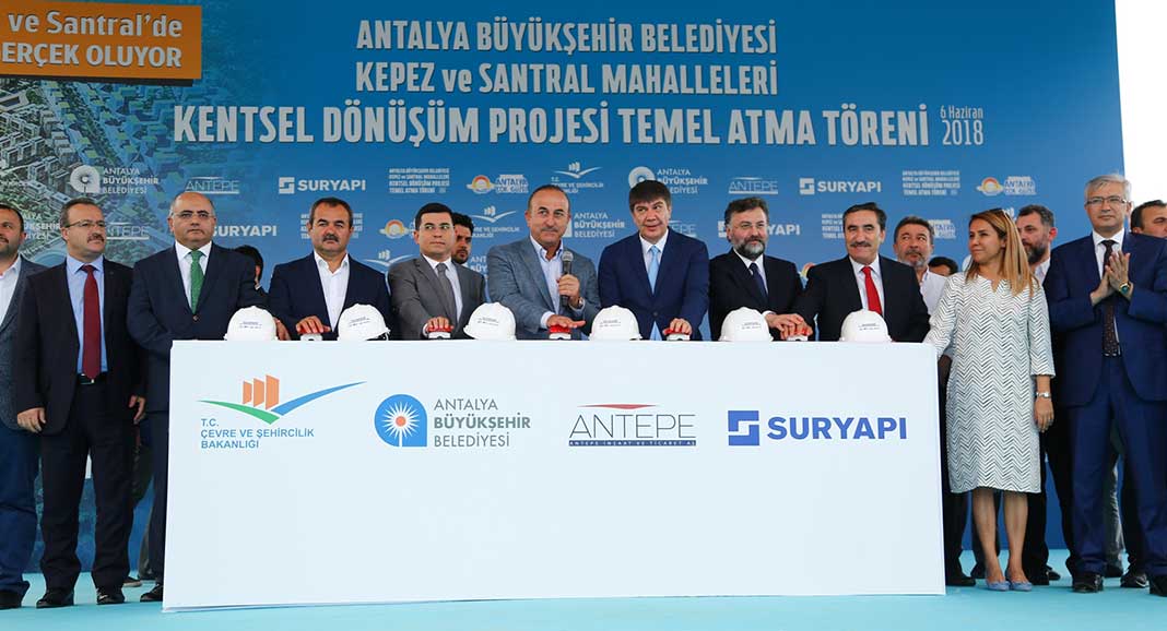 Antalya’nın Kepez ilçesi Santral bölgesinde 1 milyon 300 bin metrekarelik arazi üzerinde 19 bin bağımsız bölümden meydana gelecek şekilde Sur Yapı tarafından geliştirilen Türkiye’nin örnek teşkil edecek en büyük kentsel dönüşüm projesinde temel atma töreni; Çevre ve Şehircilik Bakanı Mehmet Özhaseki, Dışişleri Bakanı Mevlüt Çavuşoğlu, Antalya Valisi Münir Karaloğlu, Büyükşehir Belediye Başkanı Menderes Türel, Ziraat Bankası Yönetim Kurulu Başkan Yardımcısı Yusuf Dağcan, Sur Yapı Yönetim Kurulu Başkanı Z. Altan Elmas ile Sur Yapı Genel Müdürü Ufuk Elmas’ın yanı sıra üst düzey bürokratlar, hak sahipleri, vatandaşlar ve basın mensuplarının katılımıyla 6 haziran çarşamba günü gerçekleştirildi.