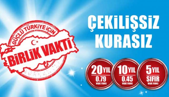 Vatandaşların ülke ekonomisine duydukları güvenin bir göstergesi olan kampanya; 20 yılda yüzde 0,79 vade farkı, 10 yılda yüzde 0,45 vade farkı, 5 yıla '0' vade farkı ve sadece yüzde 5 peşinat ile ev sahibi olmayı daha kolay hale getiriyor. Konut ve bankacılık sektörünün el ele vererek vatandaşın uygun koşullarda ev sahibi olmasını amaçlayan kampanya 31 Mart'ta sona eriyor.