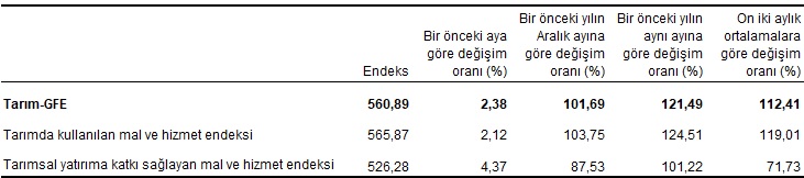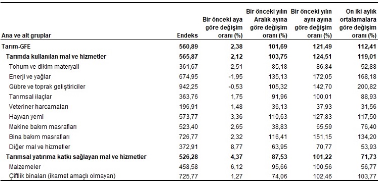 Ana gruplarda bir önceki aya göre tarımda kullanılan mal ve hizmet endeksinde %2,12, tarımsal yatırıma katkı sağlayan mal ve hizmet endeksinde %4,37 artış gerçekleşti. Bir önceki yılın aynı ayına göre göre tarımsal yatırıma katkı sağlayan mal ve hizmet endeksinde %101,22, tarımda kullanılan mal ve hizmet endeksinde %124,51 artış gerçekleşti.