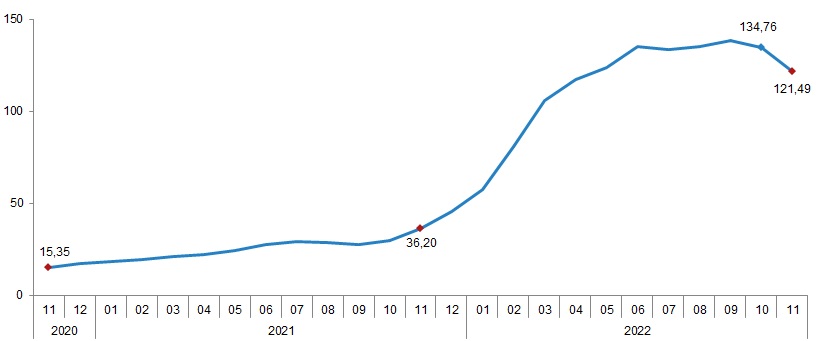 Tarım-GFE’de (2015=100), 2022 yılı Kasım ayında bir önceki aya göre %2,38, bir önceki yılın Aralık ayına göre %101,69, bir önceki yılın aynı ayına göre %121,49 ve on iki aylık ortalamalara göre %112,41 artış gerçekleşti.