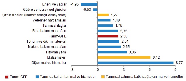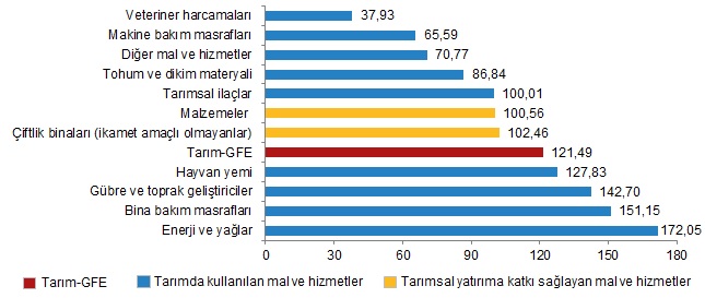 Yıllık artışın düşük olduğu alt gruplar sırasıyla, %37,93 ile veteriner harcamaları ve %65,59 ile makine bakım masrafları oldu. Buna karşılık, yıllık artışın yüksek olduğu alt gruplar ise sırasıyla, %172,05 ile enerji ve yağlar ve %151,15 ile bina bakım masrafları oldu.