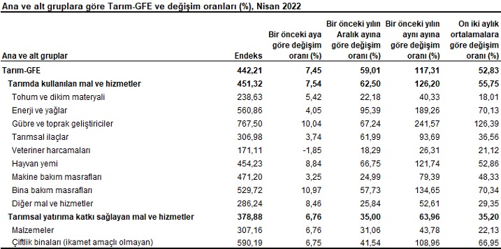 Ana gruplarda bir önceki aya göre tarımsal yatırıma katkı sağlayan mal ve hizmet endeksinde %6,76, tarımda kullanılan mal ve hizmet endeksinde %7,54 artış gerçekleşti. Bir önceki yılın aynı ayına göre göre tarımsal yatırıma katkı sağlayan mal ve hizmet endeksinde %63,96, tarımda kullanılan mal ve hizmet endeksinde %126,20 artış gerçekleşti.