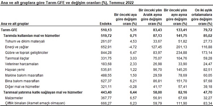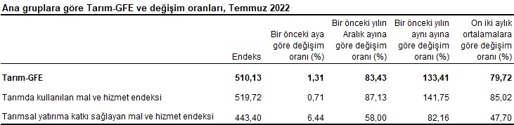 Türkiye İstatistik Kurumu (TÜİK) tarafından açıklanan Tarımsal Girdi Fiyat Endeksi (Tarım-GFE) Temmuz 2022 verilerine göre Tarımsal girdi fiyat endeksi aylık olarak yüzde 1.31 yükselirken bu artış oranı yıllık bazda yüzde 133.41 olarak gerçekleşti.