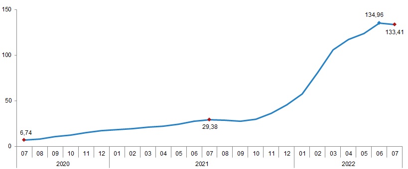 Tarım-GFE’de (2015=100), 2022 yılı Temmuz ayında bir önceki aya göre %1,31, bir önceki yılın Aralık ayına göre %83,43, bir önceki yılın aynı ayına göre %133,41 ve on iki aylık ortalamalara göre %79,72 artış gerçekleşti.