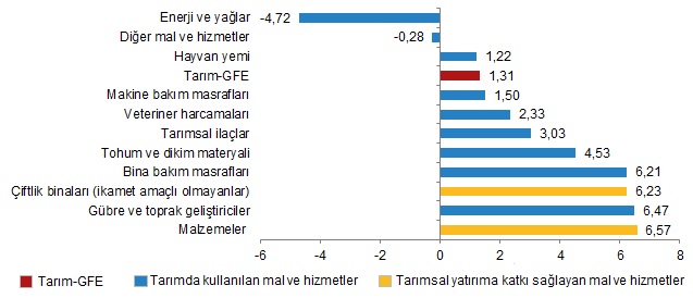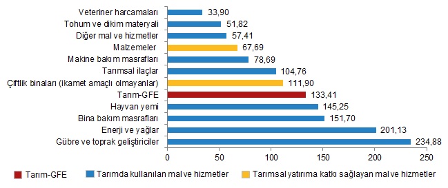 Yıllık artışın düşük olduğu alt gruplar sırasıyla, %33,90 ile veteriner harcamaları ve %51,82 ile tohum ve dikim materyali oldu. Buna karşılık, yıllık artışın yüksek olduğu alt gruplar ise sırasıyla, %234,88 ile gübre ve toprak geliştiriciler ve %201,13 ile enerji ve yağlar oldu.