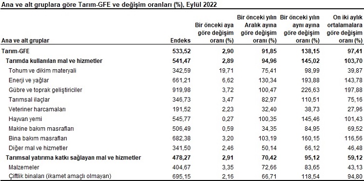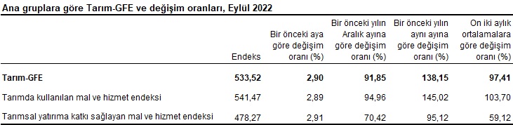 Ana gruplarda bir önceki aya göre tarımda kullanılan mal ve hizmet endeksinde %2,89, tarımsal yatırıma katkı sağlayan mal ve hizmet endeksinde %2,91 artış gerçekleşti. Bir önceki yılın aynı ayına göre göre tarımsal yatırıma katkı sağlayan mal ve hizmet endeksinde %95,12, tarımda kullanılan mal ve hizmet endeksinde %145,02 artış gerçekleşti.