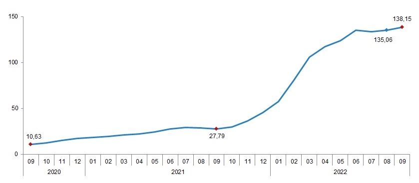Tarım-GFE’de (2015=100), 2022 yılı Eylül ayında bir önceki aya göre %2,90, bir önceki yılın Aralık ayına göre %91,85, bir önceki yılın aynı ayına göre %138,15 ve on iki aylık ortalamalara göre %97,41 artış gerçekleşti.