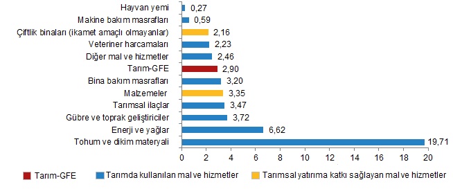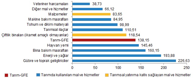 Yıllık artışın düşük olduğu alt gruplar sırasıyla, %38,73 ile veteriner harcamaları ve %66,12 ile diğer mal ve hizmetler oldu. Buna karşılık, yıllık artışın yüksek olduğu alt gruplar ise sırasıyla, %226,63 ile gübre ve toprak geliştiriciler ve %193,88 ile enerji ve yağlar oldu.