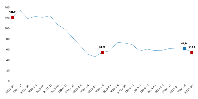 Tarım-ÜFE’de (2020=100), 2024 yılı Haziran ayında bir önceki aya göre %1,95 artış, bir önceki yılın Aralık ayına göre %21,91 artış, bir önceki yılın aynı ayına göre %54,58 artış ve on iki aylık ortalamalara göre %61,49 artış gerçekleşti.