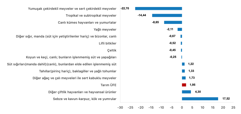 Yıllık değişimin en yüksek olduğu alt grup %156,24 artış ile yağlı meyveler, aylık değişimin en yüksek olduğu alt grup %22,70 azalış ile yumuşak çekirdekli meyveler ve sert çekirdekli meyveler oldu.