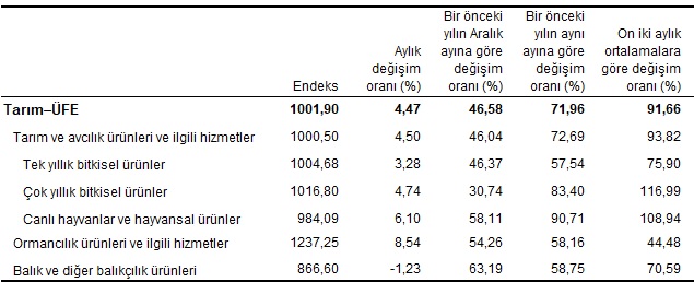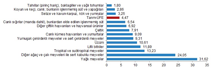 Bir önceki aya göre artışın düşük olduğu alt gruplar %1,80 ile tahıllar (pirinç hariç), baklagiller ve yağlı tohumlar ve %2,86 ile koyun ve keçi, canlı; bunların işlenmemiş süt ve yapağıları oldu. Aylık artışın yüksek olduğu alt gruplar ise, %31,62 ile yağlı meyveler ve %24,05 ile diğer ağaç ve çalı meyveleri ile sert kabuklu meyveler oldu.