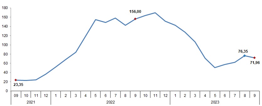 Tarım-ÜFE’de (2015=100), 2023 yılı Eylül ayında bir önceki aya göre %4,47 artış, bir önceki yılın Aralık ayına göre %46,58 artış, bir önceki yılın aynı ayına göre %71,96 artış ve on iki aylık ortalamalara göre %91,66 artış gerçekleşti.