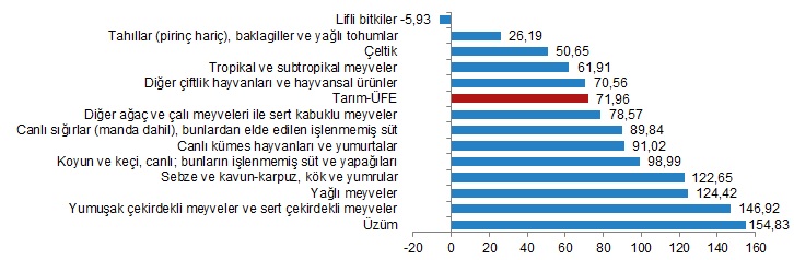 Yıllık artışın düşük olduğu alt gruplar sırasıyla, %26,19 ile tahıllar (pirinç hariç), baklagiller ve yağlı tohumlar ve %50,65 ile çeltik oldu. Buna karşılık, yıllık artışın yüksek olduğu alt gruplar ise sırasıyla, %154,83 ile üzüm ve %146,92 ile yumuşak çekirdekli meyveler ve sert çekirdekli meyveler oldu. Bir önceki yılın aynı ayına göre azalış gösteren tek alt grup ise %5,93 ile lifli bitkiler oldu.