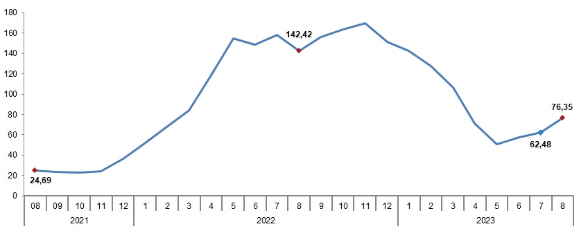 Ağustos 2023’te, endekste kapsanan 86 maddeden, 15 maddenin ortalama fiyatında azalış, 68 maddenin ortalama fiyatında ise artış gerçekleşti.