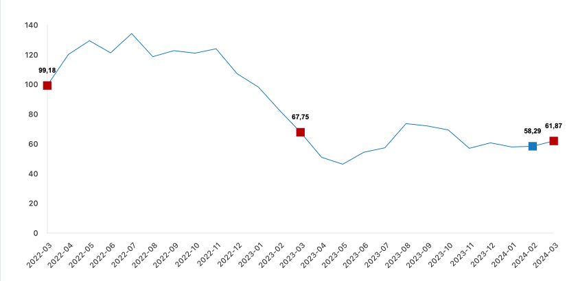 Tarım-ÜFE’de (2020=100), 2024 yılı Mart ayında bir önceki aya göre %5,57 artış, bir önceki yılın Aralık ayına göre %17,51 artış, bir önceki yılın aynı ayına göre %61,87 artış ve on iki aylık ortalamalara göre %59,98 artış gerçekleşti.
