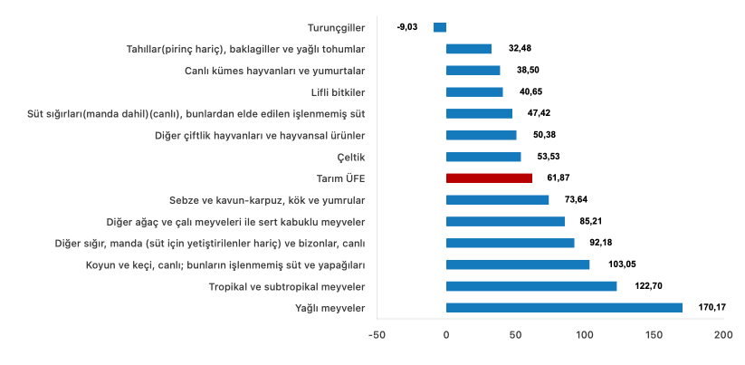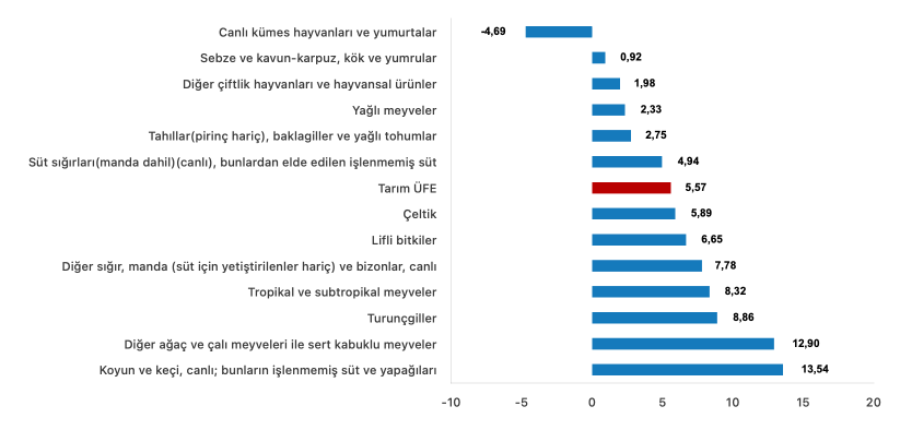 Yıllık değişimin en yüksek olduğu alt grup %170,17 ile yağlı meyveler, aylık değişimin en yüksek olduğu alt grup %13,54 ile koyun ve keçi, canlı; bunların işlenmemiş süt ve yapağıları oldu.