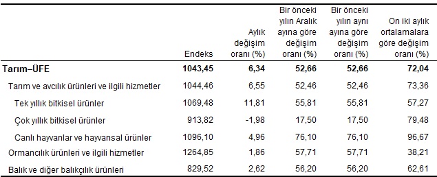 Sektörlerde bir önceki aya göre, ormancılık ürünleri ve ilgili hizmetlerde %1,86 artış, balık ve diğer balıkçılık ürünlerinde %2,62 artış ve tarım ve avcılık ürünleri ve ilgili hizmetlerde %6,55 artış gerçekleşti. Ana gruplarda bir önceki aya göre çok yıllık bitkisel ürünlerde %1,98 azalış, canlı hayvanlar ve hayvansal ürünlerde %4,96 artış ve tek yıllık bitkisel ürünlerde %11,81 artış gerçekleşti.