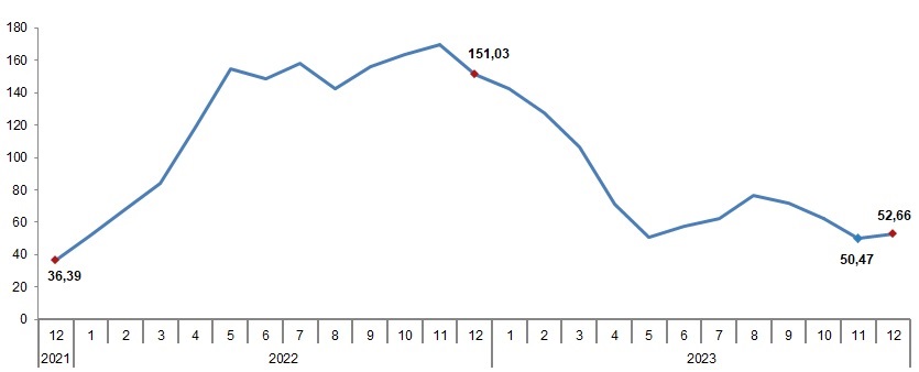 Tarım-ÜFE’de (2015=100), 2023 yılı Aralık ayında bir önceki aya göre %6,34 artış, bir önceki yılın Aralık ayına göre %52,66 artış, bir önceki yılın aynı ayına göre %52,66 artış ve on iki aylık ortalamalara göre %72,04 artış gerçekleşti.