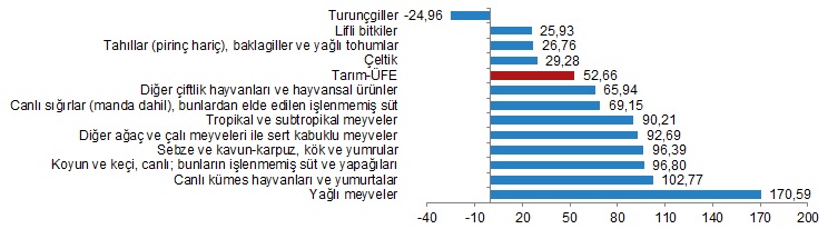 Yıllık artışın düşük olduğu alt gruplar sırasıyla, %25,93 ile lifli bitkiler ve %26,76 ile tahıllar (pirinç hariç), baklagiller ve yağlı tohumlar oldu. Buna karşılık, yıllık artışın yüksek olduğu alt gruplar ise sırasıyla, %170,59 ile yağlı meyveler ve %102,77 ile canlı kümes hayvanları ve yumurtalar oldu. Bir önceki yılın aynı ayına göre azalış gösteren tek alt grup ise %24,96 ile turunçgiller oldu.