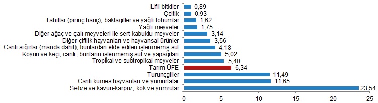 Bir önceki aya göre artışın düşük olduğu alt gruplar %0,89 ile lifli bitkiler ve %0,93 ile çeltik oldu. Bir önceki aya göre artışın yüksek olduğu alt gruplar, %23,54 ile sebze ve kavun-karpuz, kök ve yumrular ve %11,65 ile canlı kümes hayvanları ve yumurtalar oldu.