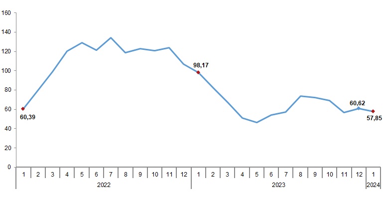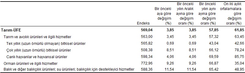 Tarım-ÜFE’de (2020=100), 2024 yılı Ocak ayında bir önceki aya göre %3,85 artış, bir önceki yılın Aralık ayına göre %3,85 artış, bir önceki yılın aynı ayına göre %57,85 artış ve on iki aylık ortalamalara göre %61,85 artış gerçekleşti.