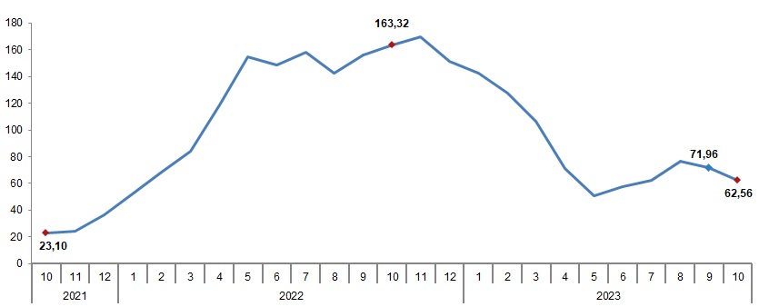Ekim 2023’te, endekste kapsanan 92 maddeden, 35 maddenin ortalama fiyatında azalış, 44 maddenin ortalama fiyatında ise artış gerçekleşti.