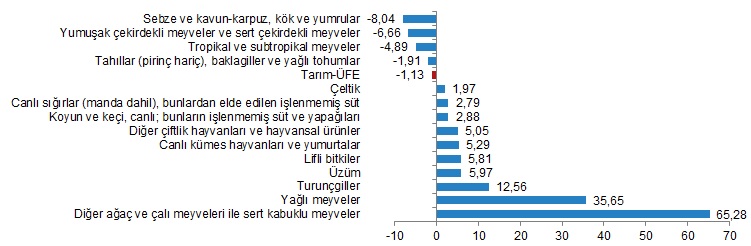 Bir önceki aya göre azalışın yüksek olduğu alt gruplar %8,04 ile sebze ve kavun-karpuz, kök ve yumrular ve %6,66 ile yumuşak çekirdekli meyveler ve sert çekirdekli meyveler oldu. Bir önceki aya göre artışın yüksek olduğu alt gruplar, %65,28 ile diğer ağaç ve çalı meyveleri ile sert kabuklu meyveler ve %35,65 ile yağlı meyveler oldu.