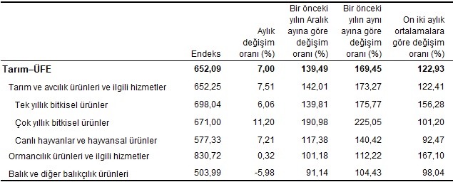 Sektörlerde bir önceki aya göre, balık ve diğer balıkçılık ürünlerinde %5,98 azalış, ormancılık ürünleri ve ilgili hizmetlerde %0,32 artış, tarım ve avcılık ürünleri ve ilgili hizmetlerde %7,51 artış gerçekleşti. Ana gruplarda bir önceki aya göre tek yıllık bitkisel ürünlerde %6,06, canlı hayvanlar ve hayvansal ürünlerde %7,21 ve çok yıllık bitkisel ürünlerde %11,20 artış gerçekleşti.
