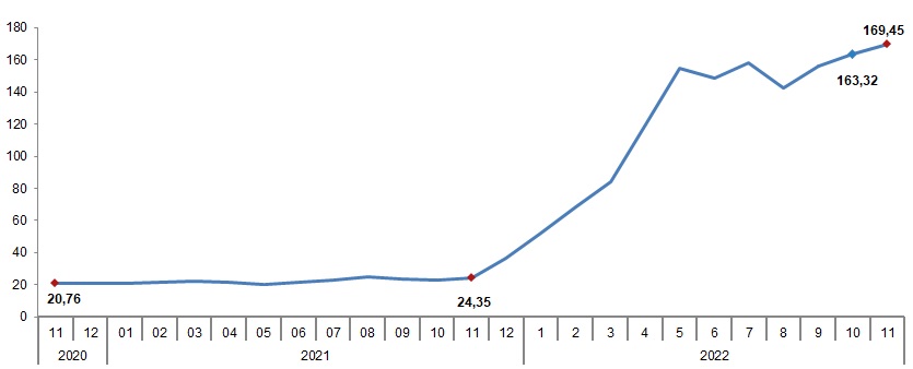 Tarım-ÜFE’de (2015=100), 2022 yılı Kasım ayında bir önceki aya göre %7,00, bir önceki yılın Aralık ayına göre %139,49, bir önceki yılın aynı ayına göre %169,45 ve on iki aylık ortalamalara göre %122,93 artış gerçekleşti.