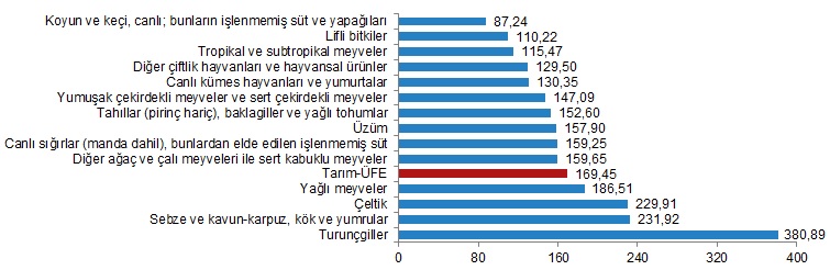 Yıllık artışın düşük olduğu alt gruplar sırasıyla, %87,24 ile koyun ve keçi, canlı; bunların işlenmemiş süt ve yapağıları ve %110,22 ile lifli bitkiler oldu. Buna karşılık, yıllık artışın yüksek olduğu alt gruplar ise sırasıyla, %380,89 ile turunçgiller ve %231,92 ile sebze ve kavun-karpuz, kök ve yumrular oldu.