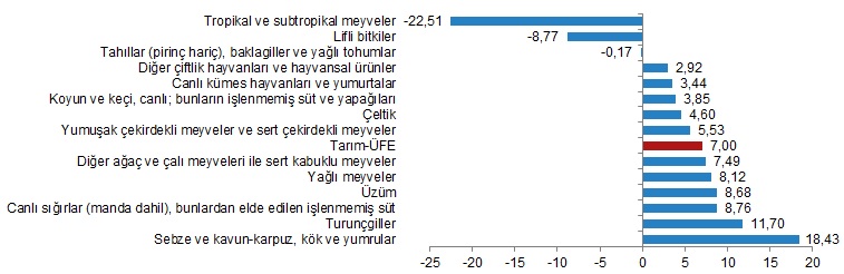 Bir önceki aya göre azalış gösteren alt gruplar sırasıyla, %22,51 ile tropikal ve subtropikal meyveler ve %8,77 ile lifli bitkiler oldu. Buna karşılık, aylık artışın yüksek olduğu alt gruplar ise %18,43 ile sebze ve kavun-karpuz, kök ve yumrular ve %11,70 ile turunçgiller oldu.