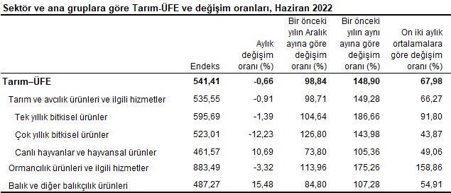 Tarım-ÜFE’de (2015=100), 2022 yılı Haziran ayında bir önceki aya göre %0,66 azalış, bir önceki yılın Aralık ayına göre %98,84, bir önceki yılın aynı ayına göre %148,90 ve on iki aylık ortalamalara göre %67,98 artış gerçekleşti.