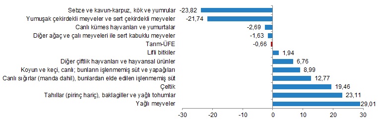 Bir önceki aya göre azalışın yüksek olduğu alt gruplar sırasıyla, %23,82 ile sebze ve kavun-karpuz, kök ve yumrular ve %21,74 ile yumuşak çekirdekli meyveler ve sert çekirdekli meyveler oldu. Buna karşılık, aylık artışın yüksek olduğu alt grup ise %29,01 ile yağlı meyveler ve %23,11 ile tahıllar (pirinç hariç), baklagiller ve yağlı tohumlar oldu.