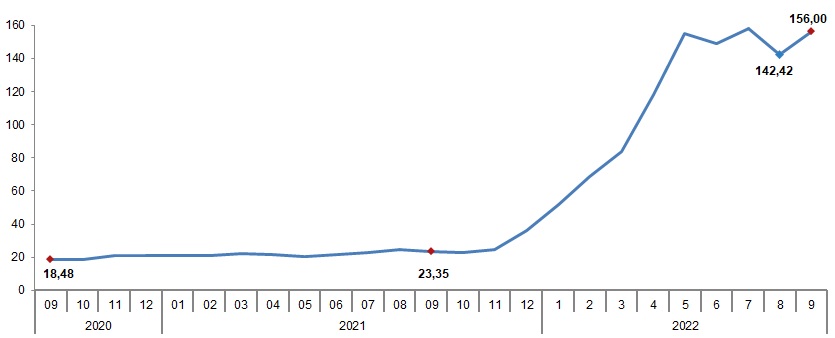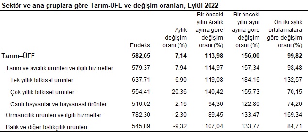 Tarım-ÜFE’de (2015=100), 2022 yılı Eylül ayında bir önceki aya göre %7,14, bir önceki yılın Aralık ayına göre %113,98, bir önceki yılın aynı ayına göre %156,00 ve on iki aylık ortalamalara göre %99,82 artış gerçekleşti.