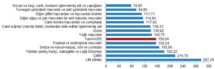 Yıllık artışın düşük olduğu alt gruplar sırasıyla, %78,80 ile koyun ve keçi, canlı; bunların işlenmemiş süt ve yapağıları ve %94,80 ile yumuşak çekirdekli meyveler ve sert çekirdekli meyveler oldu. Buna karşılık, yıllık artışın yüksek olduğu alt gruplar ise sırasıyla, %297,29 ile lifli bitkiler ve %215,70 ile çeltik oldu.