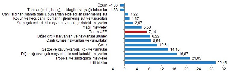 Bir önceki aya göre azalış gösteren alt gruplar sırasıyla, %1,36 ile üzüm ve %1,33 ile tahıllar (pirinç hariç), baklagiller ve yağlı tohumlar oldu. Buna karşılık, aylık artışın yüksek olduğu alt grup ise %29,45 ile lifli bitkiler ve %21,05 ile tropikal ve subtropikal meyveler oldu.