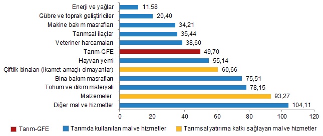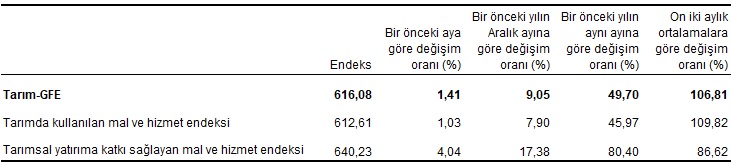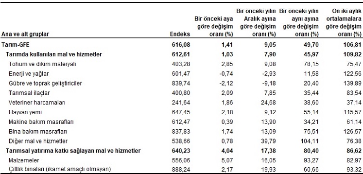 Ana gruplarda bir önceki aya göre tarımda kullanılan mal ve hizmet endeksinde %1,03, tarımsal yatırıma katkı sağlayan mal ve hizmet endeksinde %4,04 artış gerçekleşti. Bir önceki yılın aynı ayına göre göre tarımda kullanılan mal ve hizmet endeksinde %45,97, tarımsal yatırıma katkı sağlayan mal ve hizmet endeksinde %80,40 artış gerçekleşti.