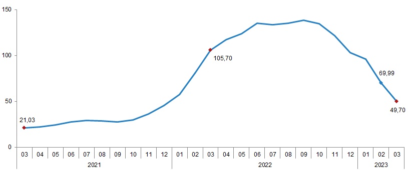 Türkiye İstatistik Kurumu (TÜİK), Mart 2023 itibarıyla Tarımsal Girdi Fiyat Endeksi (Tarım-GFE) aylık olarak %1.41, yıllık bazda ise %49.70 artış kaydetti.
