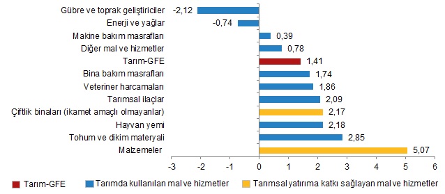 Bir önceki aya göre azalış gösteren alt gruplar sırasıyla, %2,12 ile gübre ve toprak geliştiriciler ve %0,74 ile enerji ve yağlar oldu. Buna karşılık, aylık artışın yüksek olduğu alt gruplar ise sırasıyla, %5,07 ile malzemeler ve %2,85 ile tohum ve dikim materyali oldu.