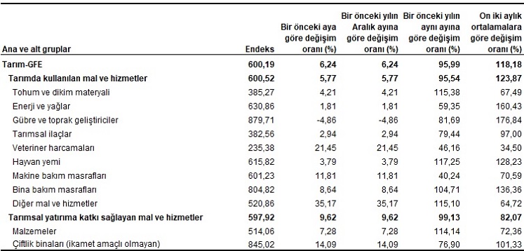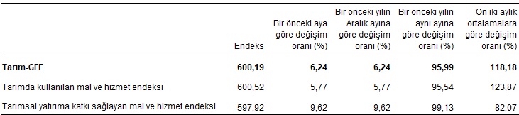 Ana gruplarda bir önceki aya göre tarımda kullanılan mal ve hizmet endeksinde %5,77, tarımsal yatırıma katkı sağlayan mal ve hizmet endeksinde %9,62 artış gerçekleşti. Bir önceki yılın aynı ayına göre göre tarımda kullanılan mal ve hizmet endeksinde %95,54, tarımsal yatırıma katkı sağlayan mal ve hizmet endeksinde %99,13 artış gerçekleşti.