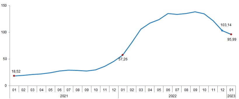 Tarım-GFE’de (2015=100), 2023 yılı Ocak ayında bir önceki aya göre %6,24, bir önceki yılın Aralık ayına göre %6,24, bir önceki yılın aynı ayına göre %95,99 ve on iki aylık ortalamalara göre %118,18 artış gerçekleşti.