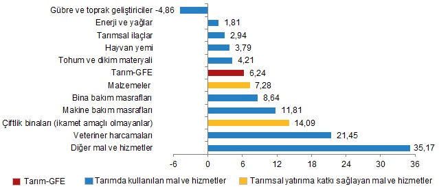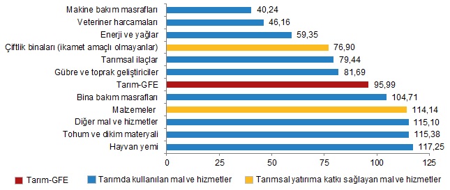 Yıllık artışın düşük olduğu alt gruplar sırasıyla, %40,24 ile makine bakım masrafları ve %46,16 ile veteriner harcamaları oldu. Buna karşılık, yıllık artışın yüksek olduğu alt gruplar ise sırasıyla, %117,25 ile hayvan yemi ve %115,38 ile tohum ve dikim materyali oldu.