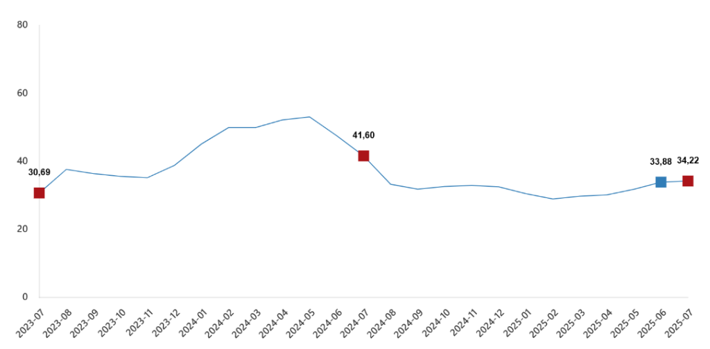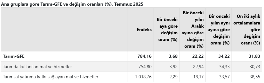 Tarım-GFE’de (2020=100), 2025 yılı Temmuz ayında bir önceki aya göre %3,68 artış, bir önceki yılın Aralık ayına göre %22,22 artış, bir önceki yılın aynı ayına göre %34,22 artış ve on iki aylık ortalamalara göre %31,83 artış gerçekleşti.